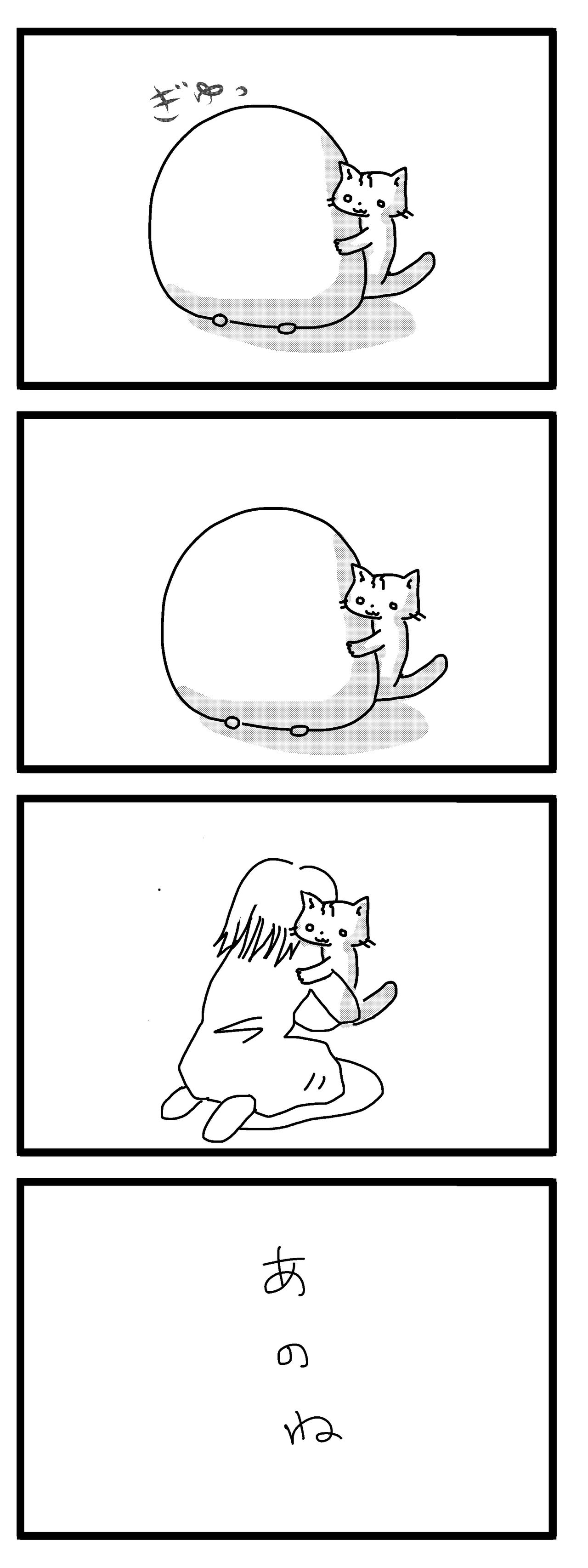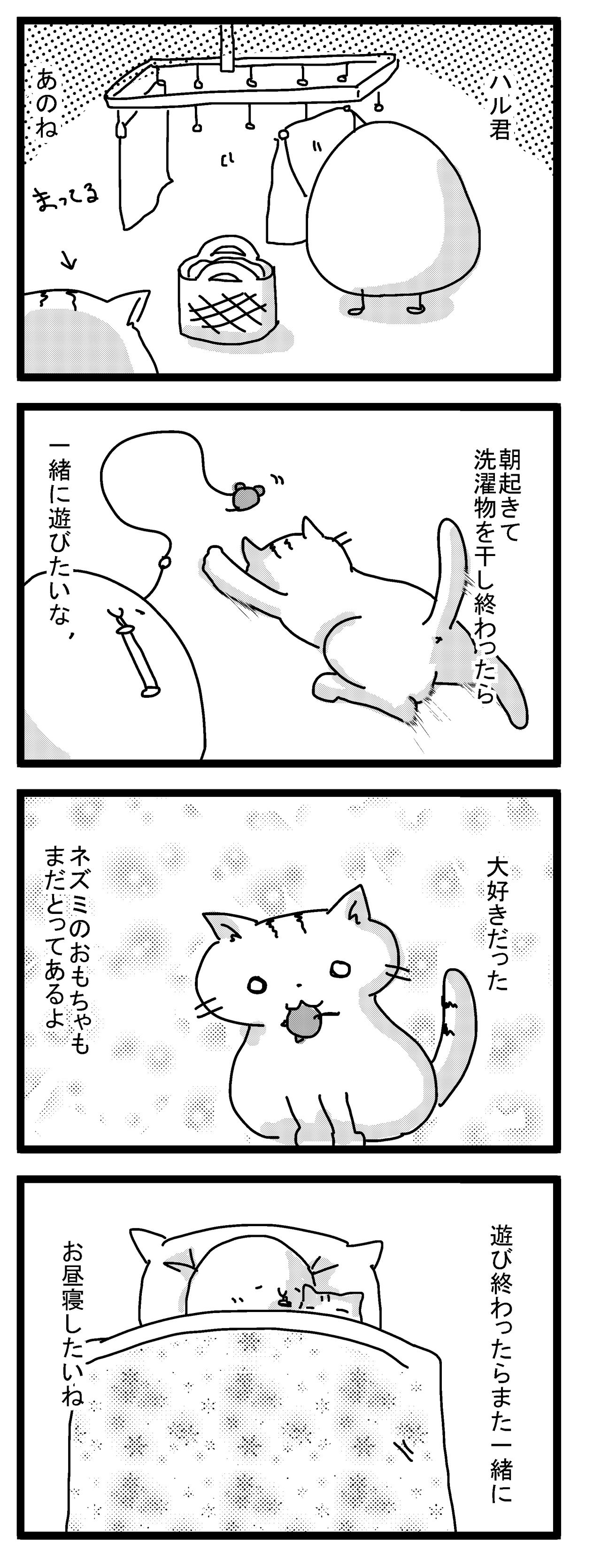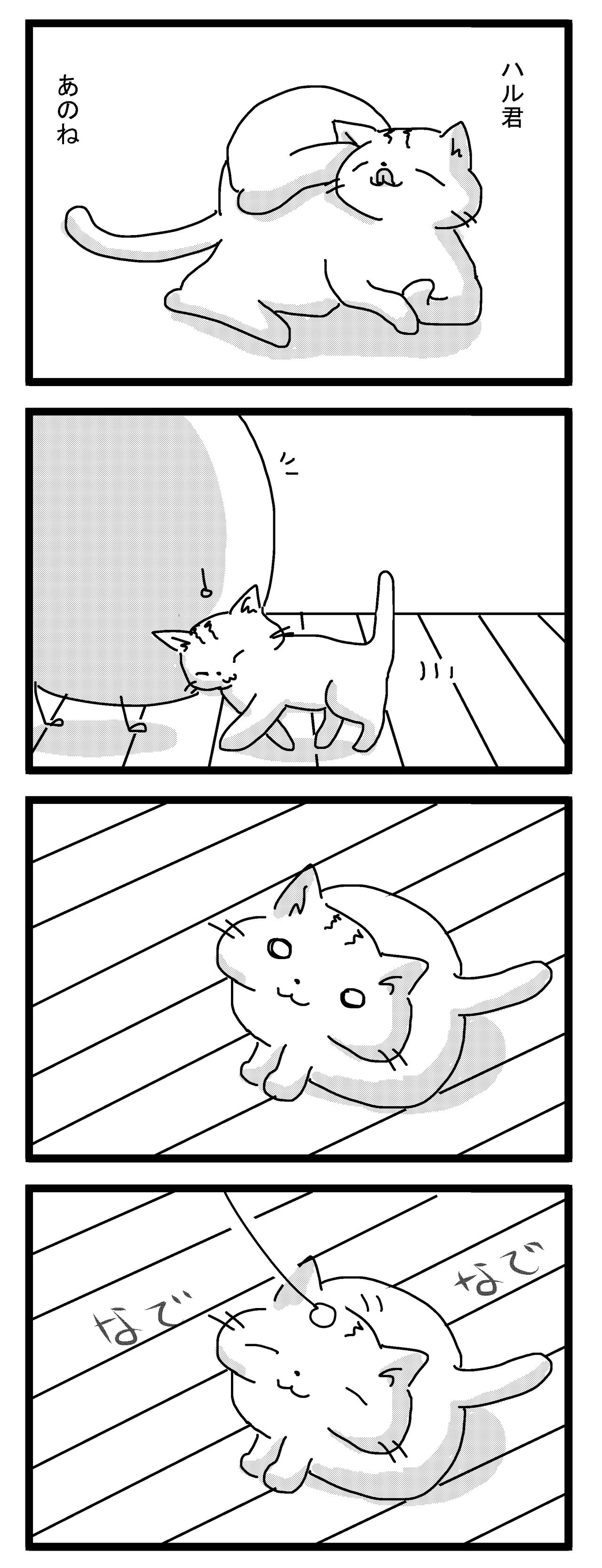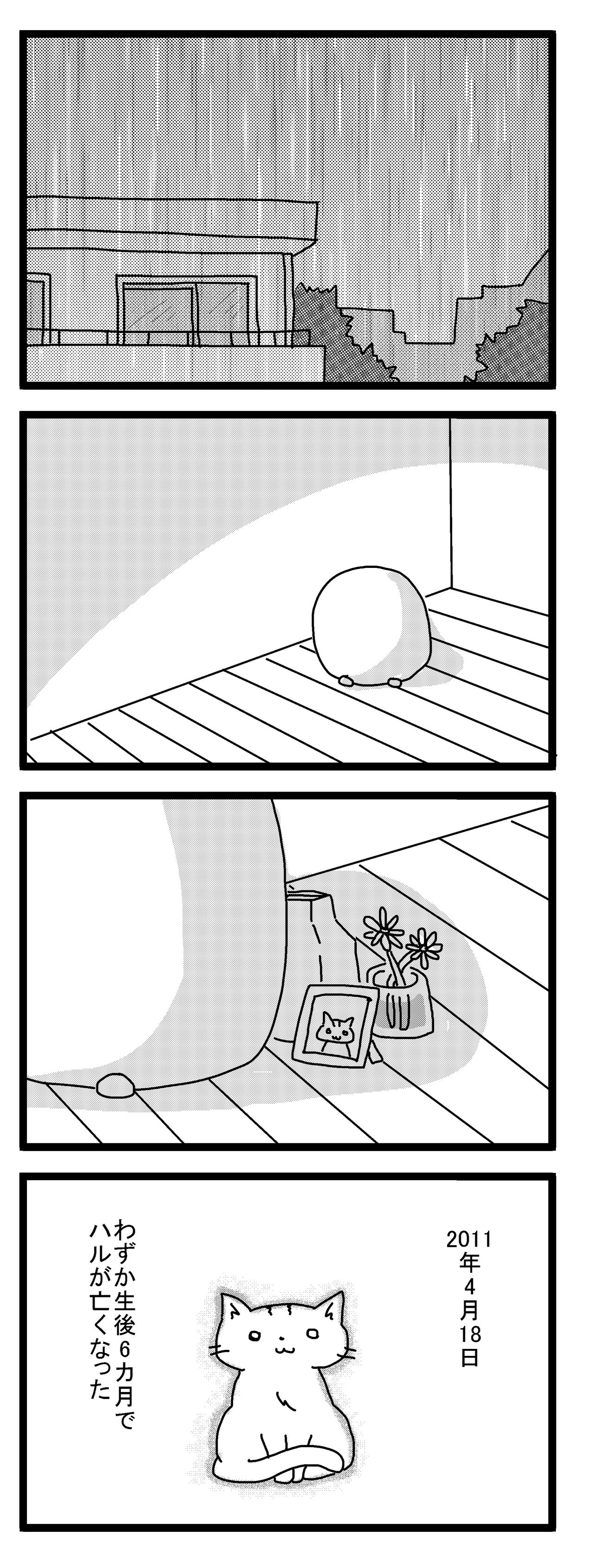 玄関を開けてもハルが出迎えてくれない。あぐらをかいて座っても、膝にハルが乗ってこない。野菜炒めを作ってご飯を食べていても、ハルがおかずを奪おうとしない。お風呂にお湯をためていてもハルが見にこない。部屋の掃除をしていてもハルがほうきを追いかけることがなく、布団にはいってもハルがもぐりこんでこない。…ハルはもういないんだ、とわかりました。